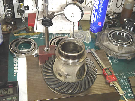 今回R&Pの変更はありませんが、デフサイドベアリング(写真右)が交換になりますので、バックラッシュの再確認&ベアリングロードの取り直しが必要になりました。