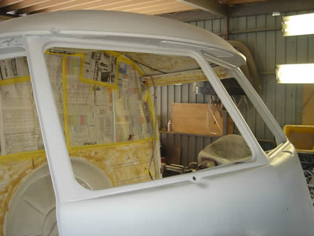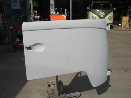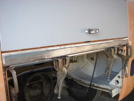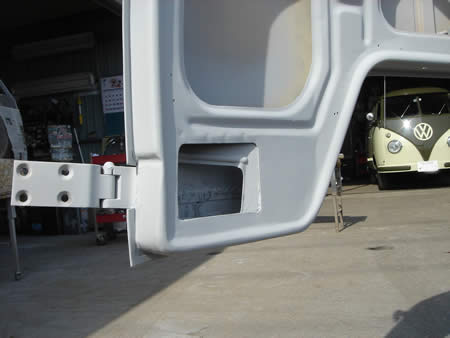溶接が完了した右ドアを車体に取り付け、ロック取り付け確認、チリ調整をしながらドアパネルの面を修正しています。