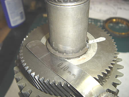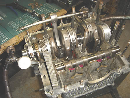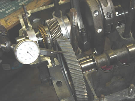 ケースにクランクシャフト&カムシャフトを組み付け、カムギアのバックラッシュを点検。