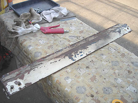 先ず、裏側の補強パネルを剥がし、腐食した下側のパネルを切開します。