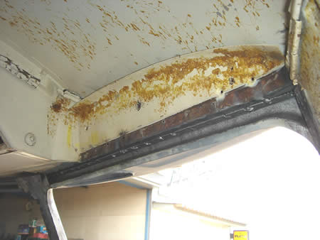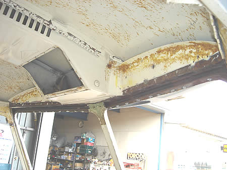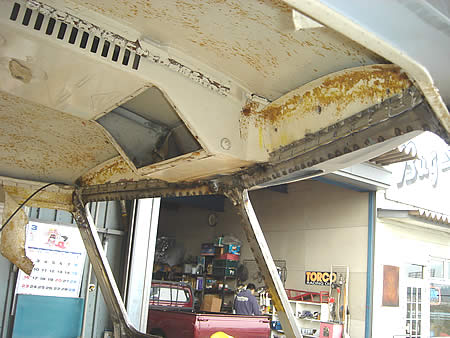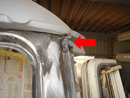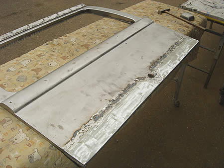 先ず内側に回り込んでいる上面のパネルをルーフにスポット溶接します。(写真左)