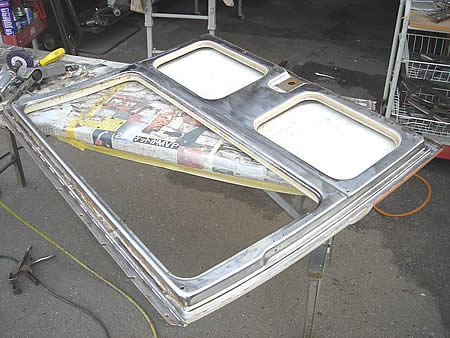 同時進行で行っているリアハッチのパネル張替えは、インナーパネルの切り出しが終わり、内側の防錆処理をしてから本溶接に入ります。