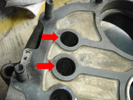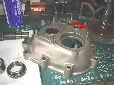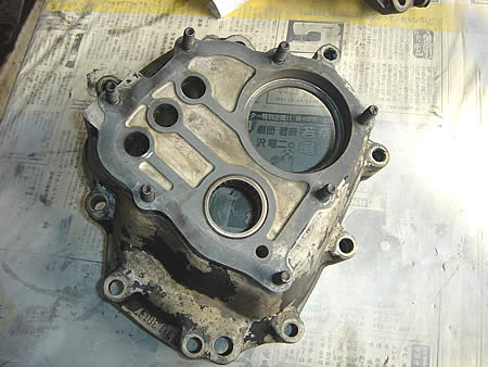 この部分はブッシング加工(写真右)で修正する事が出来るのですが、今回のケースはメインシャフトのベアリングホールまでダメージが有りますので交換になります。