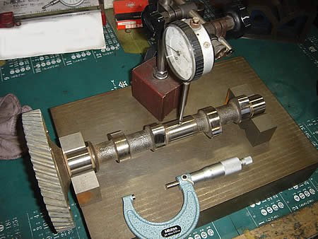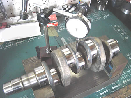 写真左はクランクシャフトの曲がり、摩耗を測定しています。