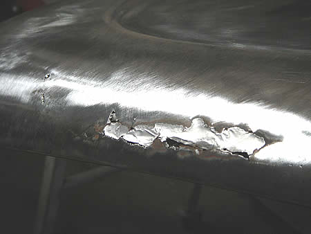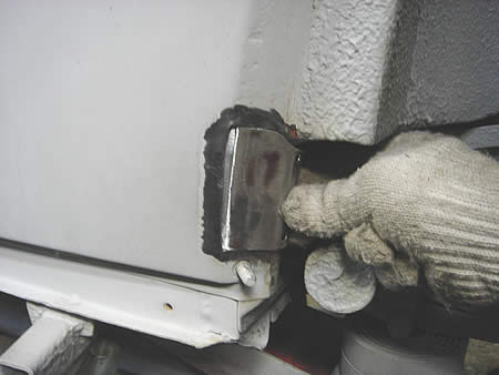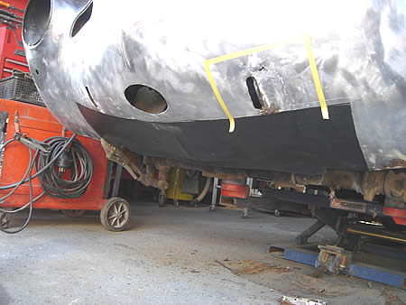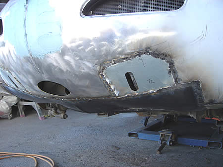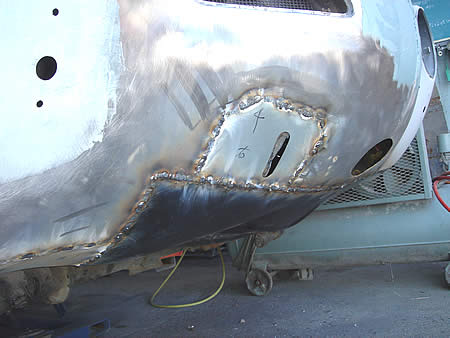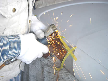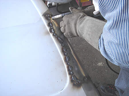 錆穴が開いていた部分を切開、新しく製作したパネルを溶接しているところです。