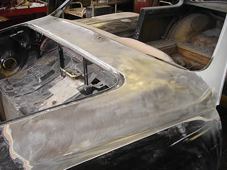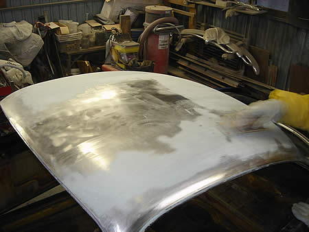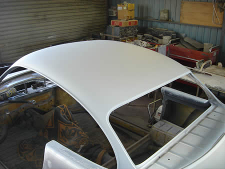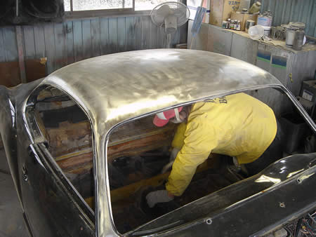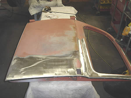 ルーフの板金作業は、先ずハンマーリングで凸凹を修正、最低限のパテで面修正を行います。