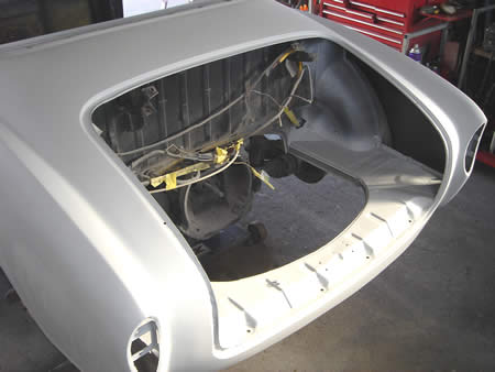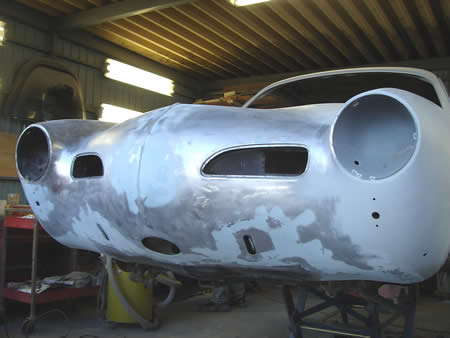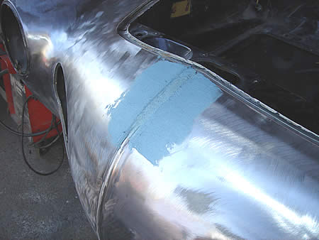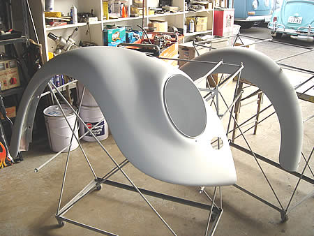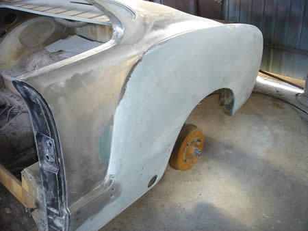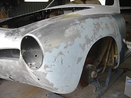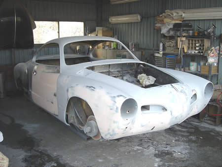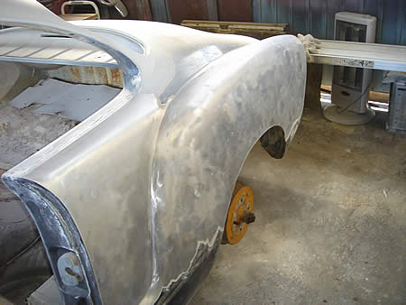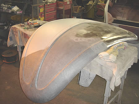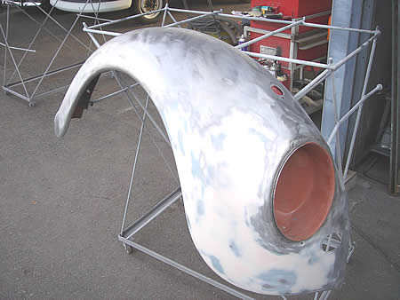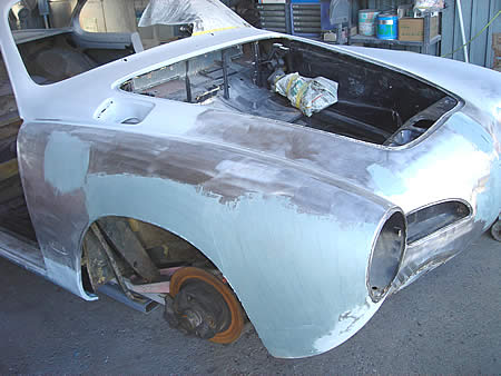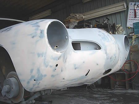 今だグレーパテのリアフェンダー・・・カルマンのボディーラインをくずさぬよう、慎重に作業しております!