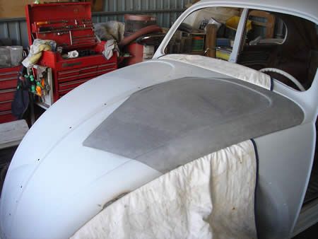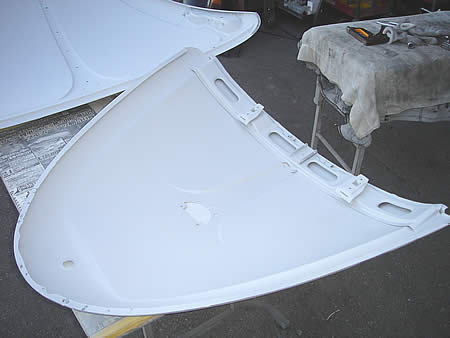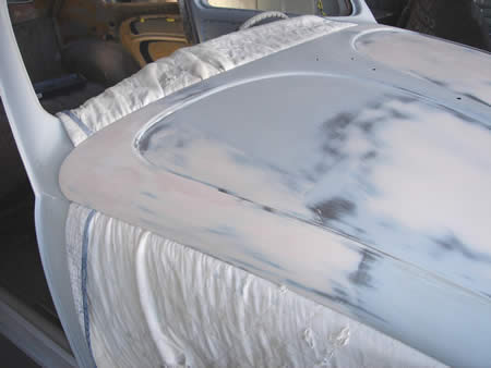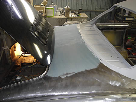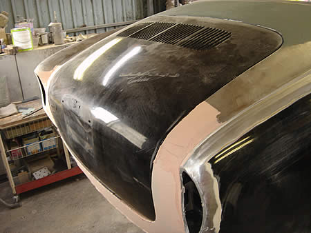 長かったフロントフードの板金作業もいよいよ終盤・・・今日にはサフェーサーが入るでしょう!